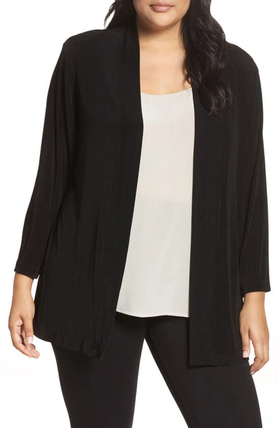 A fluid and drapey stretch-knit fabric gives graceful weight and movement to an easygoing cardigan. 30" length (size 1X) No closure Long sleeves 94% acetate, 6% Lycra(R) spandex Dry clean or hand wash, dry flat. Made in the USA Encore