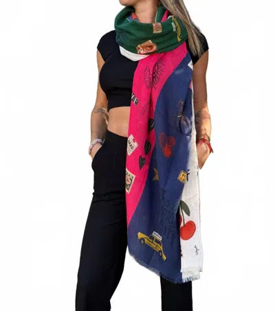 The perfect accessory to complete any look.Introducing the Graffiti Rectangular Scarf by Vilagallo, a dynamic accessory featuring vertical blocks in cream, navy, fuchsia, and forest green complemented with graffiti-style messages and motifs. This scarf boasts a soft and comfortable feel, thanks to its blend of 42% cotton, 33% modal, and 25% wool. Perfect for adding a pop of color and unique style to any outfit. A must-have piece for those who love to make a bold fashion statement.