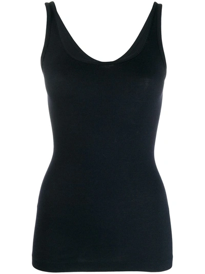 Blue pima cotton blend basic ribbed vest from Vince featuring a round neck, a sleeveless design and a straight hem.