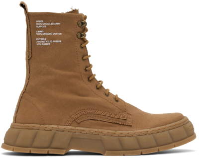 Mid-calf recycled twill boots in tan. Raw edges throughout. · Lace-up closure · Logo bonded in white at tongue · Pull-loop at heel collar · Logo printed at heel · Text printed in white at outer side · Signature treaded recycled rubber sole · Antiqued gold-tone hardware Supplier color: Tan