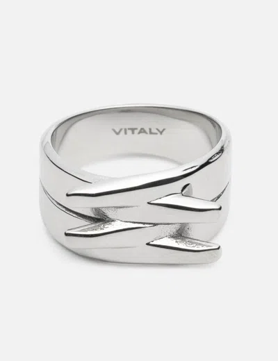 Vitaly Crosshatch Made with recycled stainless steel Wide-band ring Three sharply carved inlays Waterproof Color: Stainless Steel
