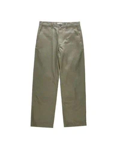 Relaxed straight fit five pocket chino work pant. Featuring slant pockets, coin pocket, with one button closure and one drop rear pockets, and embroidered vowels logo on rear right pocket. Reinforced along the hem and belt loops. Treated with cold mercerization process for a crisp glossy sheen. Chino fabric treated with cold mercerization This treatment gives the fabric a glossy finish, maintaining its crispness even after wash. To reduce crisp finish, use any household softener for first few washes.
