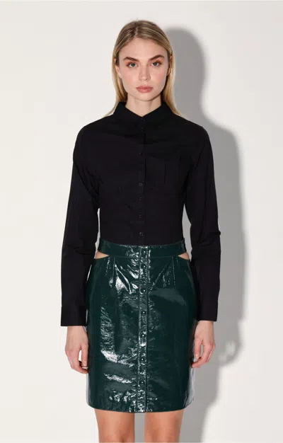 With side cut outs and button detail, the Viola Skirt is a pencil skirt with attitude!Faux front buttons; exposed center back zipper closure; Fitted waistband; Above knee length; Fully linedShell - 100% Patent Leather Lining - 100% PolyesterProfessional Clean Only