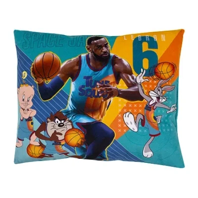 The Space Jam decorative Pillow is made from soft plush fabric with a printed front featuring LeBron James and his Looney tunes pals Bugs Bunny, Porky Pig, and Taz in bold colors of orange, blue and teal; reverses to solid teal. Measuring 12"H x 15"W, this pillow is perfect for naps or relaxing. This product is designed to meet all your needs and more, providing both comfort and style, making it a great addition to your home or nursery.Features: Screen PrintedShape: RectanglePillow Size: 12 X 15 InBack Fabric: KnitFront Fabric: KnitFiber Content: 100% PolyesterFilling Content: 100% PolyesterCare: Spot CleanMaterial: FabricCountry of Origin: Imported