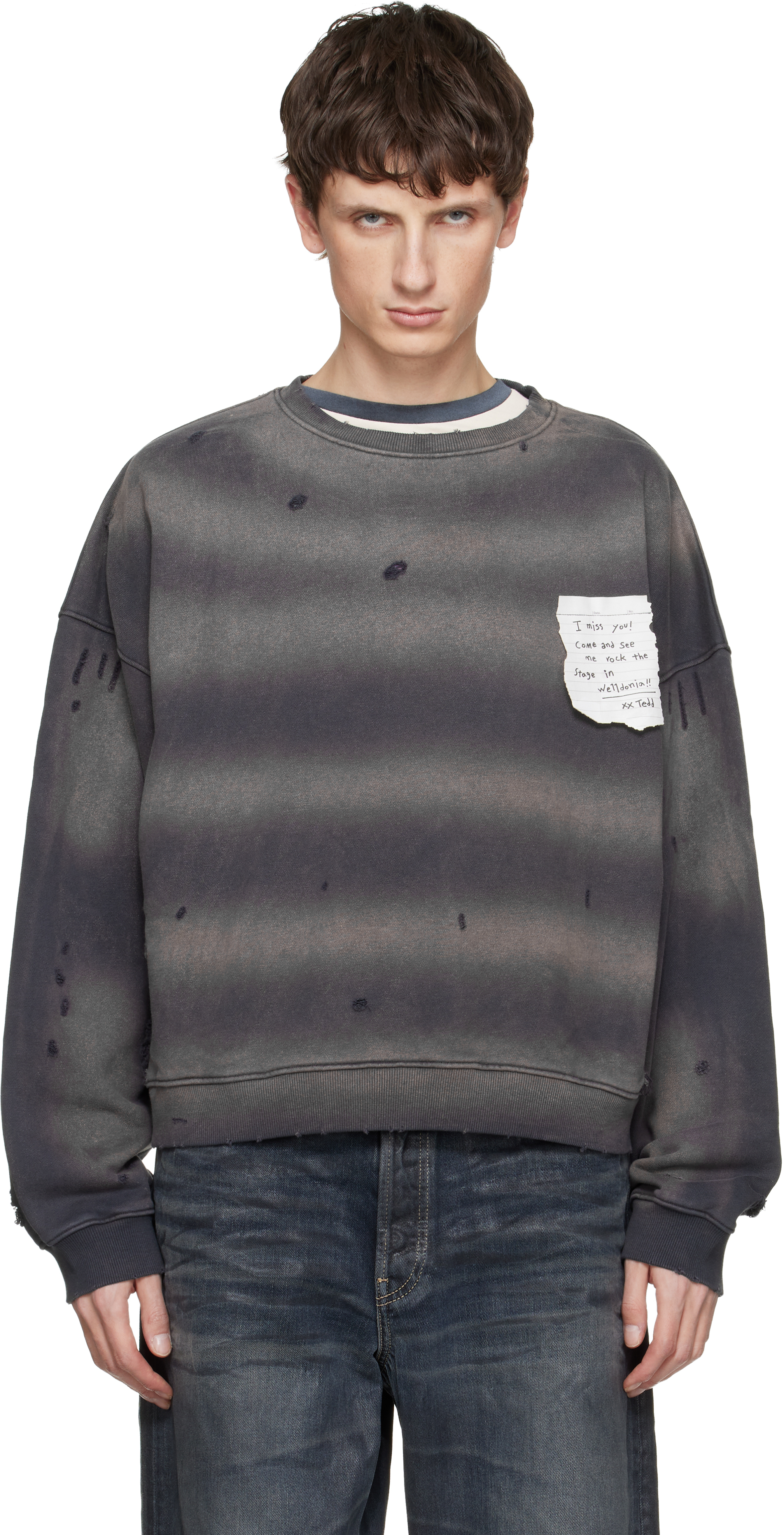 French terry sweatshirt. · Bleached effect and distressing throughout · Rib-knit crewneck, hem, and cuffs · Graphic patch at chest · Dropped shoulders · Logo embroidered at back hem Supplier color: Charcoal