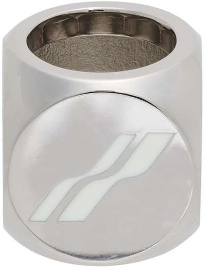 Graphic band ring in silver-tone brass. Logo in white at face. Supplier color: White