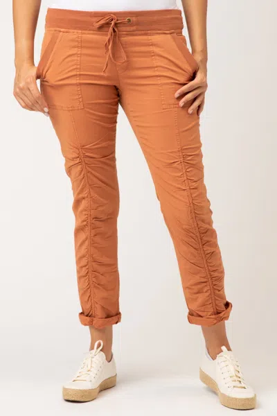 One of our best-sellers, this is the perfect every day "run your errands & look great all-day" pant. It features a drawstring waistband, two front pockets, clean back, ruching on pant leg, style lines for added structure, and drawstring at hem. Styling tip: Looks great rolled up.Stretch Poplin: 96/4 Cotton/Spandex.2x1 Rib waistband & pocket accents: 95/5 Cotton/SpandexInseam: ~31"Front Rise: ~9.5"Back Rise: ~15.25"Waistband: DrawstringColor Description: Robust burnt orangePreshrunkMachine washableImportedMODELKeidy is wearing size Small.Height: 5'10" | Bust: 36C | Waist: 28 | Hip: 38