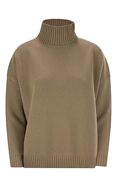 Knitted sweater made of high-quality pure wool yarn, knitted in satin stitch, with a high collar and long, low-cut sleeves. The model is characterised by a soft volume and slightly oversized line. - High neck - Soft fit - Dropped shoulders DESIGNER ID: 2425366082600 004
