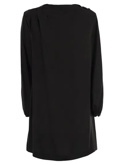 Soft lighting, winter atmospheres and new style rituals: Weekend Max Mara's The Holiday Edit FW25 explores the magic of the festive season. Short dress in shiny satin crêpe envers with a feminine silhouette, featuring an asymmetrical draped motif on the neckline that adds volume and movement to the garment. - Flared line - Boat neckline - Puff sleeves with button at the bottom - Covered button closure on the left shoulder - Unlined - Flush pockets DESIGNER ID: 2525226043600 015