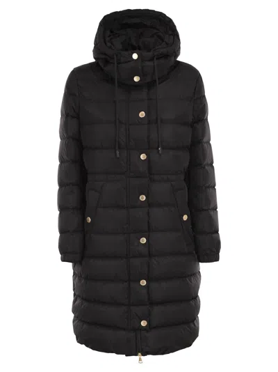 Single-breasted midi down jacket in water-repellent nylon taffeta with horizontal quilted pattern. - Slim fit with adjustable drawstring waist - High collar with detachable hood - Long sleeves with elasticated cuffs - Concealed zip fastening and press studs - Slash pockets on the sides - Goose down padding DESIGNER ID: 2525496052600 004