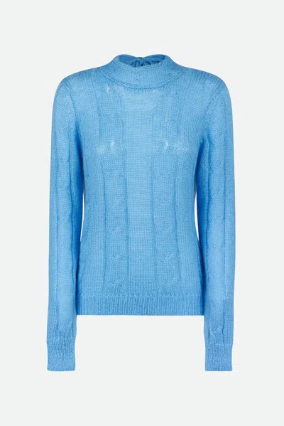 Light blue sweater by Weili Zheng. Braid embroidery, crew neck with ribbed bottom and cuffs. Back neckline with bow. Brand logo on internal label. Composition: 40% Nylon, 30% Mohair, 30% Wool