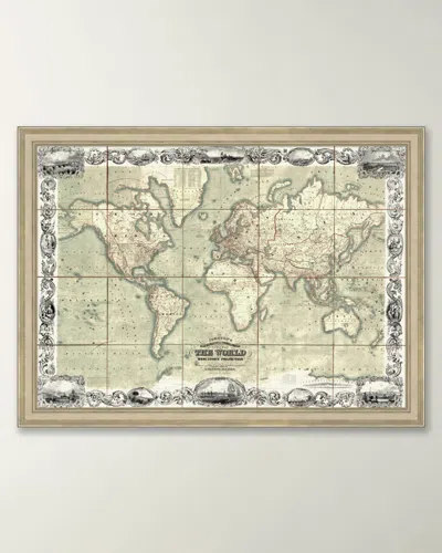 Map of the world on matte giclée paper. Foamcore backing and plexiglass cover. Wood moulding. 45.8"W x 1.4"D x 33.8"T. Made in the USA. Boxed weight, approximately 21 lbs.