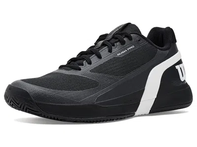 Wilson Rush Pro 5 - Men's Cross Training Shoes : Black/White/Stormy Weather : The Wilson Rush Pro 5 shoes are built on the iconic Rush Pro 4.5 with enhanced cushioning, energy return, durability, and a pedal-specific rubber outsole to enhance pivot movement on the court. Perfect for players of all styles, these low-top shoes deliver comfort and control, enabling swift transitions and explosive performance on the padel court. They are made of a mesh upper, a polyurethane insole, and a polyester lining. Their thermoplastic polyurethane Speed Plate enables quick transitions, while the Endofit midfoot support and thermoplastic polyurethane stability chassis ensure a locked-in fit and exceptional lateral control for aggressive play. From the super-compressed sockliner to the midsole for maximum comfort, these shoes provide optimal rebound and cushioning. These lace-up shoes will become your go-to choice for outdoor adventures. ; Round toe silhouette. ; Imported. Measurements: ; Heel Height: 9 10 in ; Product measurements were taken using size 9, width D - Medium. Please note that measurements may vary by size. | Wilson Rush Pro 5 Men's Cross Training Shoes Black/White/Stormy Weather : 7.5 D - Medium, Textile
