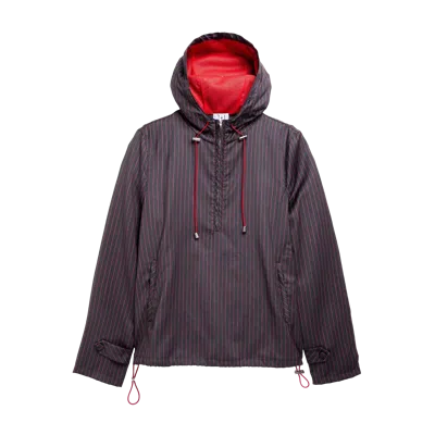 The Winnie Alvin Pullover featuring all-over graphic stripes, a half-zip closure, lined drawstring hood with fastened pulls, side pockets, button tab sleeves, and drawcord hem.