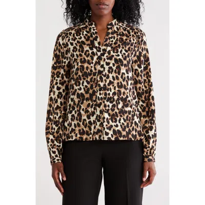 A fierce allover print defines this button-up top made from a stretch-kissed crepe fabric. Front button closure Mandarin collar Long sleeves with button cuffs 97% polyester, 3% spandex Hand wash, dry flat Imported