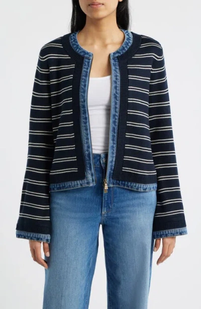 Add bold, mixed-media style to your layered outfits in a zip-front jacket that pairs cozy sweater yarns with nonstretch denim trim. Flared sleeves complete the offbeat look. Front zip closure 100% acrylic with 100% cotton contrast Hand wash, dry flat Imported