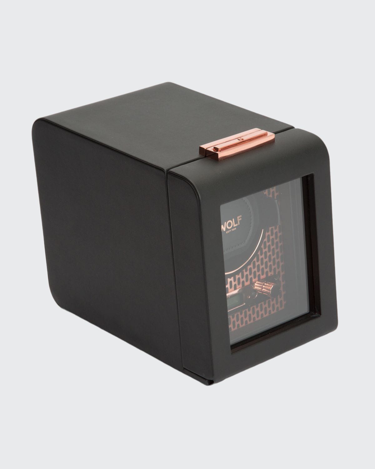 Handcrafted single watch winder case. Copper-plated laser cut perforated steel case. Features micro suede interior, locking glass cover, backlit LCD display, copper finished hardware, and a single winding module. Rotation options: can be set between 300 and 1200 TPD (Turns Per Day). Double the amount of TPD by selecting bi-directional. Patented Innovation - Every WOLF winder counts the precise number of rotations. All other winders estimate the number of rotations. Imported.