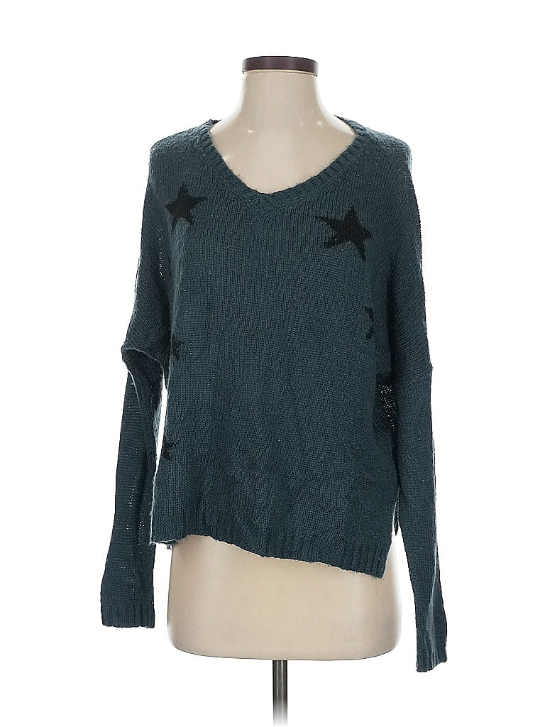 Wooden Ships Pullover Sweater, Size: X-Small. Item Details: Teal, Stars Pattern, Scoop Neck, Long Sleeve, Glitter, Women's Tops, Acrylic/Mohair/Wool