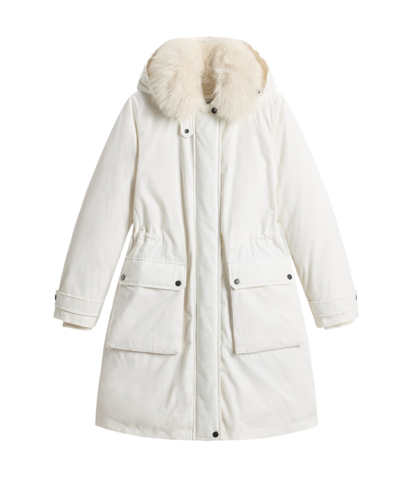 Looking for something to keep you warm during those chilly days without sacrificing style? This parka combines functionality with a touch of elegance, featuring materials and design that ensure comfort no matter what Mother Nature throws at you. A perfect companion for winter adventures or just a stroll in the park. Two front flap pockets for easy storage. Adjustable drawstring waist for a personalized fit. Detachable faux fur collar for versatile style options. Padded with 90% down and 10% feather for maximum warmth. Durable blend of polyamide, cotton, and polyester. | Woolrich Women's Arctic Technical Fabric Parka in White | Size Medium | CFWWOU1091FRUT3780 Color 8270
