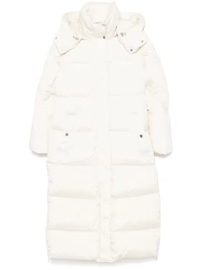 white down-feather filling quilted insulated design water-resistant front press-stud and zip fastening detachable drawstring hood high neck long sleeves rubberised logo detail ribbed cuffs two side stud-fastening pockets side zip fastening logo print at the hood internal patch pockets full lining straight hem long length