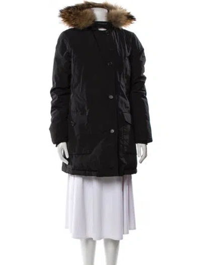 Woolrich Down Coat Black With Hood Fur Trim & Stand Collar Knee-Length Flap Pockets & Button Closure Fit: Coats by Other Designer typically fit true to size. Unfortunately, due to restrictions, this item may not be eligible for shipping in all areas. | Woolrich Down Coat in Black, Women's L