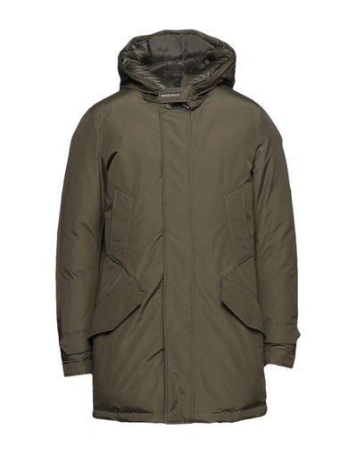 techno fabric, brand logo, solid color, hooded collar, single-breasted , long sleeves, duck down filling, zipper closure, snap buttons fastening, multipockets, contains non-textile parts of animal origin , Color: Military green , Size: XL