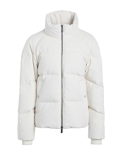 velvet, ribbed, brand logo, solid color, turtleneck, single-breasted , long sleeves, duck down filling, ribbed cuffs, zips at hem, multipockets, pocket with snap fasteners, this item contains down or feather sourced from farms where animal welfare is valued., stretch, contains non-textile parts of animal origin, single-breasted jacket, small sized , Color: Ivory , Size: L