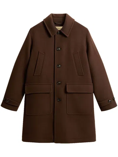 coffee brown virgin wool blend felted front button fastening spread collar long sleeves two chest welt pockets two front flap pockets belted cuffs internal zip-fastening pocket straight hem