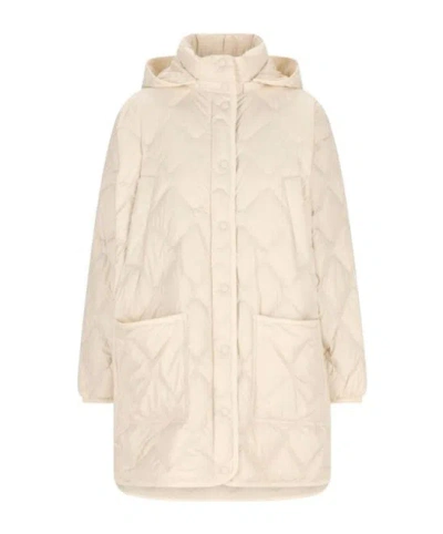Long sleeves, patch pockets, slanted pockets, snap button fastening, hooded down jacket.