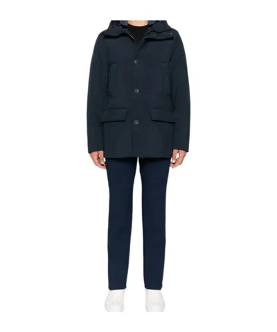 Jacket with button fastening, slanted pockets, flap pockets, long sleeves and a hood.