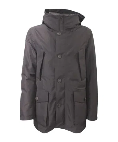 Parka with button fastening, long sleeves, flap pockets and a hood.