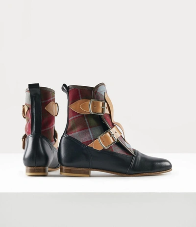 The Seditionaries boots were introduced in 1976, coinciding with the rebranding of Vivienne Westwood's boutique as 'Seditionaries: Clothes for Heroes.' Featuring the iconic "Vivienne's Tartan" motif, the boots are embellished with belted leather straps and roller buckle details, evoking themes of restriction and control inspired by bondage and fetish wear.