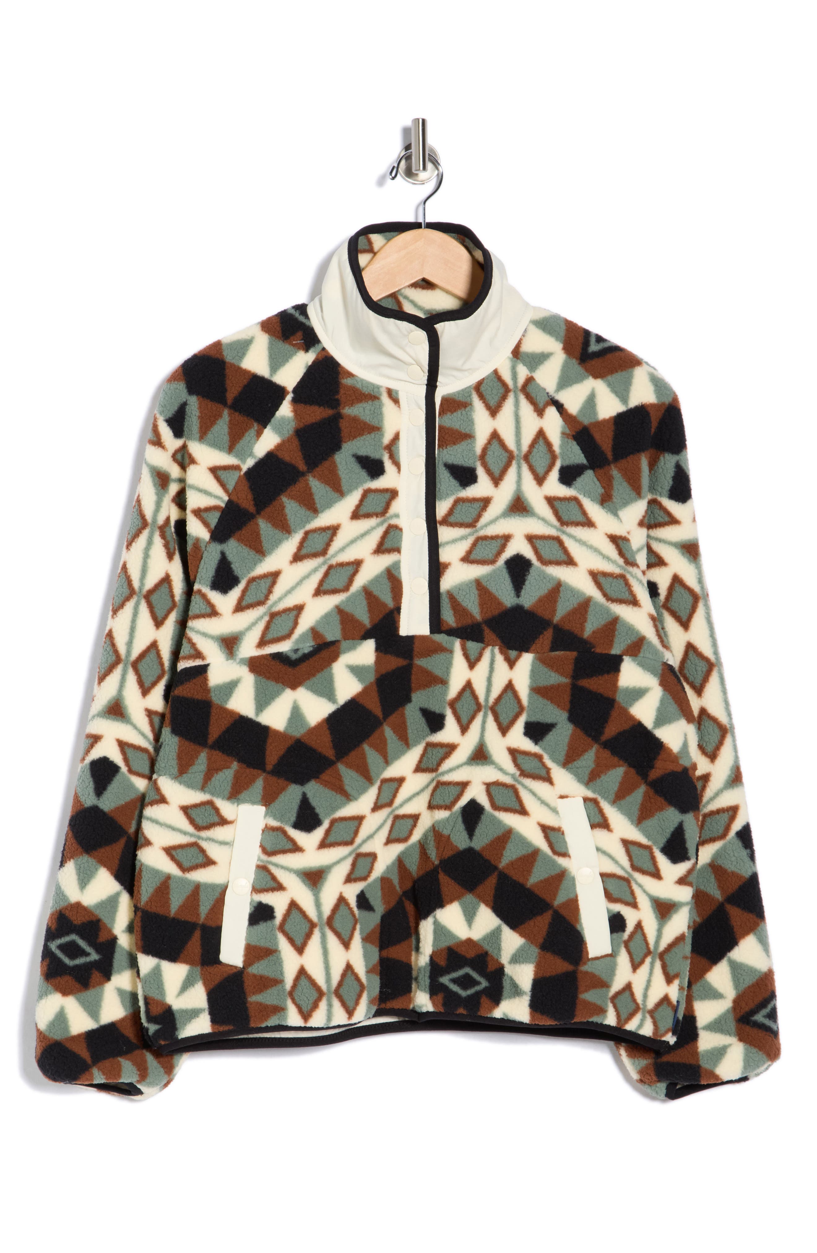 A Western-inspired print lends of-the-moment charm to a trendy pullover cut from plush high-pile fleece for warmth and comfort on chilly days. 25 3/4" length Button half placket Stand collar Long sleeves Front slant pockets Lined 100% polyester Machine wash, tumble dry Imported