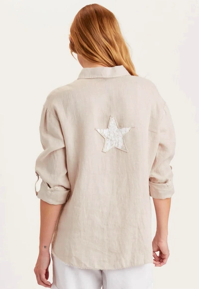 Patched and distressed, Babin Button-Up has a screen printed star stitched to the center back of this roll-up sleeve boyfriend shirt.Light Linen - 100% Linen.Center Front - ~22.25"Center Back - ~27"Preshrunk.Machine washable.Imported.