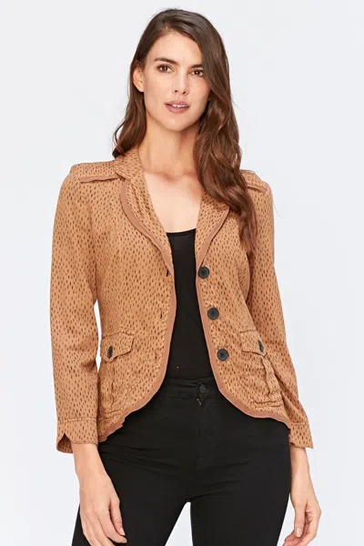 A light weight, casual blazer with twill tape rounded hem and shoulder lapel, scalloped cuff, and two box pleat flap pockets.Bedim Printed Twill - 50/47/3 Tencel/Rayon/Spandex.Color description: Dark burnt wheat.Center front length: ~24"Center back length: ~26.5"Preshrunk.Machine washable.Imported.MODELModel is wearing size Small.Height: 5'10"Bust: 34 BWaist: 26"Hip: 36.5"