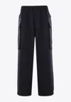 Material: 100% recycled polyester. Elastic drawstring waistband. Front zip and button closure. Two side welt pockets. Two back flap pockets. Two cargo pockets. Side logo lettering. Straight hem