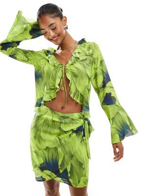 Frill Detail Tie Front Blouse In Lime Print - Part Of A Set-multi