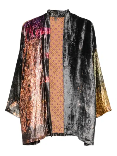black metallic effect open front three-quarter sleeves patterned inner panel