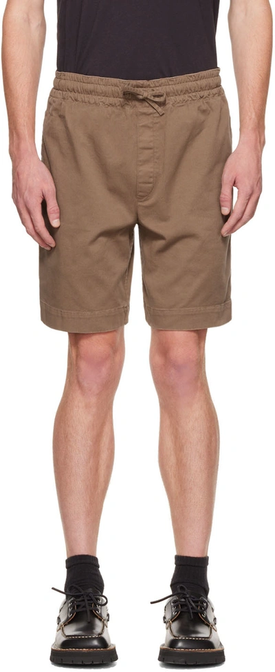 drawstring track shorts from YMC featuring caramel brown, cotton, drawstring fastening, straight leg and rear welt pocket.