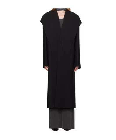 Twill coat with shawl collar and hood with draped jersey panels, button closure at front, welt pockets, padded shoulders, central vent at back hem, welt pockets at interior and full satin lining.