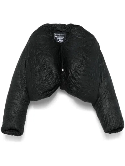 The Y/Project cropped puffer jacket is made of crinkled fabric and filled with synthetic padding. It stands out for its sculptural design with oversized volumes, a central zip, and elasticized cuffs. The model is 177 cm tall and wears a size FR 36. Colours: Black Composition: Technical Made in: Poland MPN: 103JA002 F547