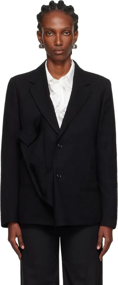 Brushed wool twill blazer. · Raw edges throughout · Notched lapel · Button closure · Welt pockets and draped panel at front · Central vent at back hem · Full cupro satin lining Supplier color: Black
