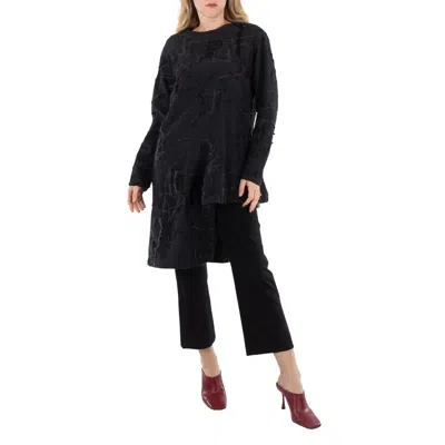 Y'S Ladies Tops. Fashion category - Shirts & Blouses. SKU - YJ-B15-114-01. Material - Wool. Color - Grey. YS Wool Glen Check Lace-Up Shoulder Detail Top. This Glen plaid blouse features a ripped look with randomly patterned cut jacquard on a wool base. The left shoulder is laced, allowing bare skin and inner clothing to show, with adjustable ties to fully close the lacing. 100% Wool.