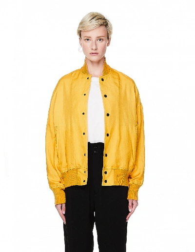 Bright yellow silk angel print bomber jacket from Y's featuring a ribbed collar, long sleeves, a front button fastening and a ribbed hem and cuffs.