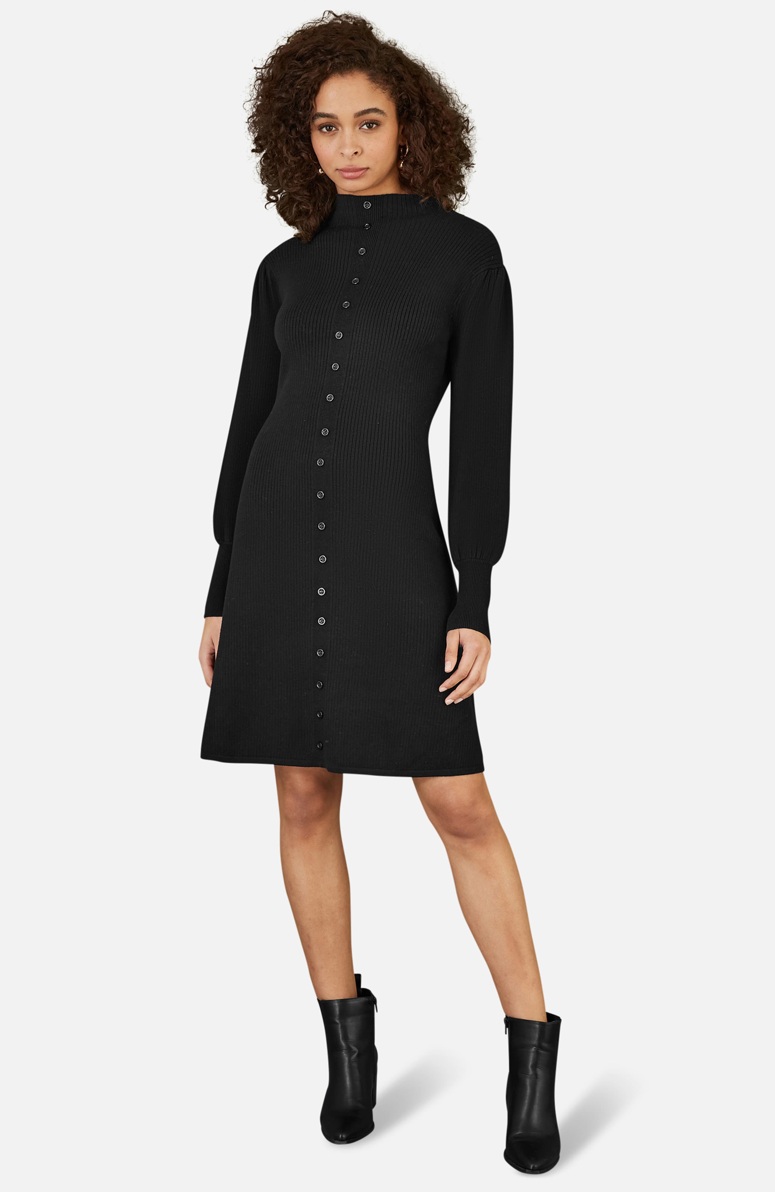 Start the new season with style in this midi dress from Yumi with a button up fastening from collar to hem. With balloon sleeves that cuff at the wrist at add to the smart and chic silhouette. The ribbed knit is soft and looks perfect with tights and boots for cooler days. 45% Viscose 28% Polyamide 27% Polyester Machine Washable Fashion model is 5' 10" and wears a size Small or 10