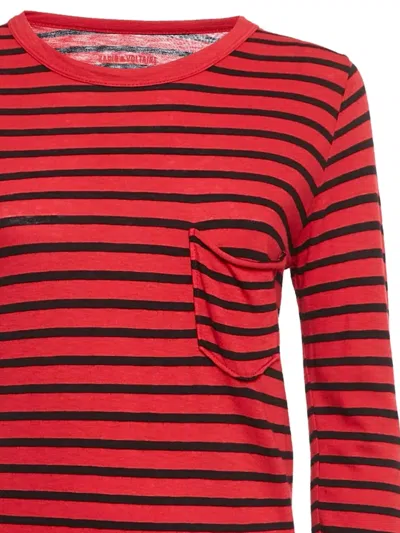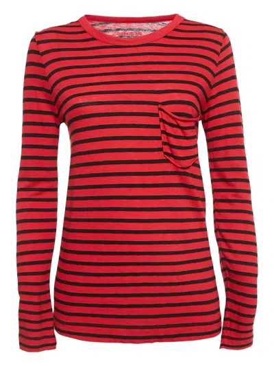 red cotton jersey knit striped pattern long sleeves crew neck chest pocket Condition: GOOD. This previously owned and used item is in good condition with minimal signs of use. This may include fading of material or plating and scratches.