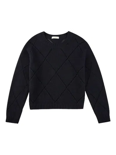 dark blue diamond pattern open knit round neck long sleeves