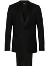 black wool cady texture tailored design Blazer: peak lapels front button fastening shoulder pads long sleeves with buttoned cuffs chest welt pocket two front jetted pockets multiple internal jetted pockets English rear vents curved hem full lining Trousers: mid-rise concealed front button, hook and zip fastening two side slash pockets two rear button-fastening jetted pockets straight leg