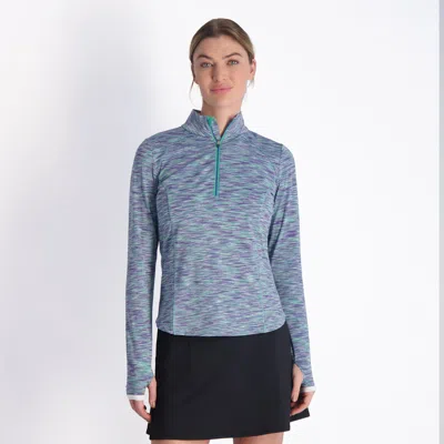 The ultimate fashion layering piece with incredible detail, our Shae Zip Mock is a tonal space dyed knit with added pops of contrast color. Perfect for the course or a long run down the river, you'll stay cool, cute, and sporty all at once. Shell Fabric: Space Dyed Stretch Polyester Knit 88% Polyester / 12% Spandex UPF 50 Exposed contrast zipper with orbit logo pull Contrast mesh knit back panel for extra breathability Thumbhole at cuff to help keep sleeves down and hands warm Machine wash