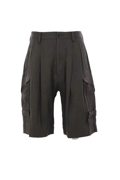 Ziggy Chen cargo shorts crafted from a dark khaki hemp blend. Featuring elastic details at the waist, a front button/zip closure, belt loops, multiple pockets, and double pleats.